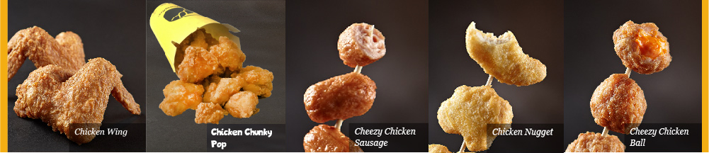 We have: Chicken Wing, Mushroom Chicken'O, Chicken Nugget, Cheezy Chicken Ball, Cheezy Chicken Sausage, Chicken Chunky Pop and Jumbo Chicken Drum (selected outlets)